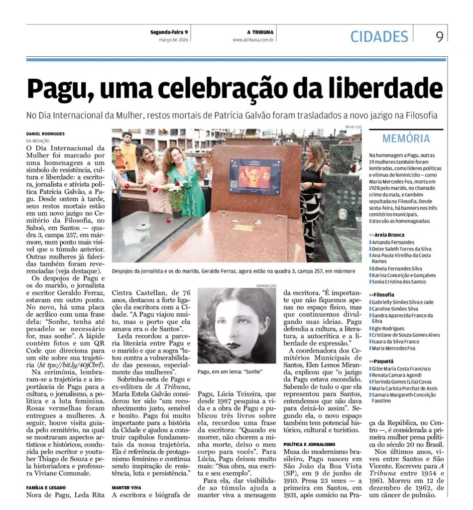 Patrícia Galvão, a Pagu, foi transferida para um novo jazigo solo no Cemitério Filosofia (Saboó), em Santos. A cerimônia ocorreu no Dia da Mulher (8), em homenagem à sua trajetória de luta pela liberdade, história e cultura. A iniciativa foi da Coordenadoria de Cemitérios da Prefeitura de Santos. Confira o que saiu na mídia sobre o assunto: